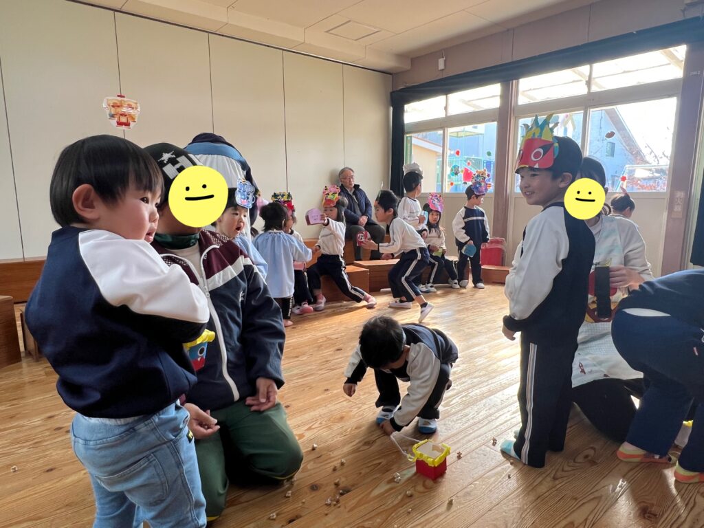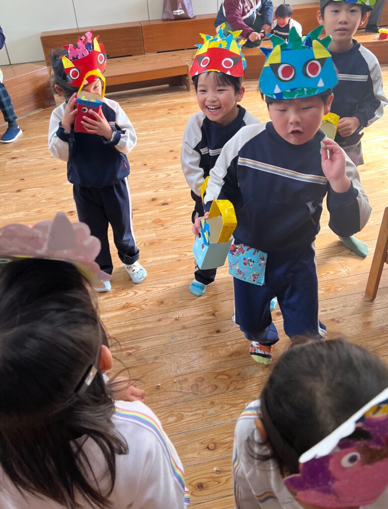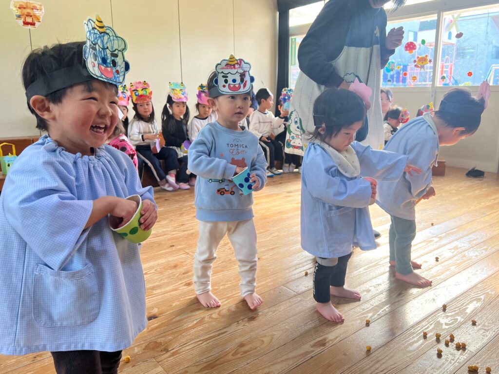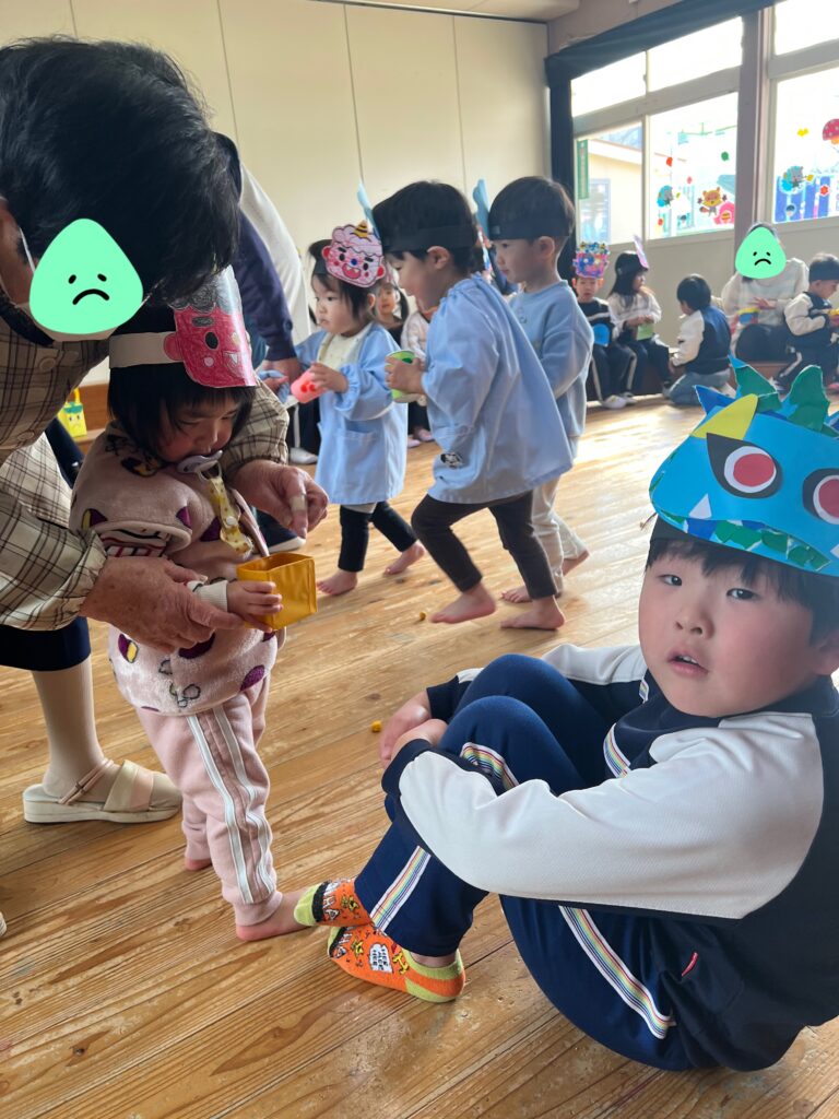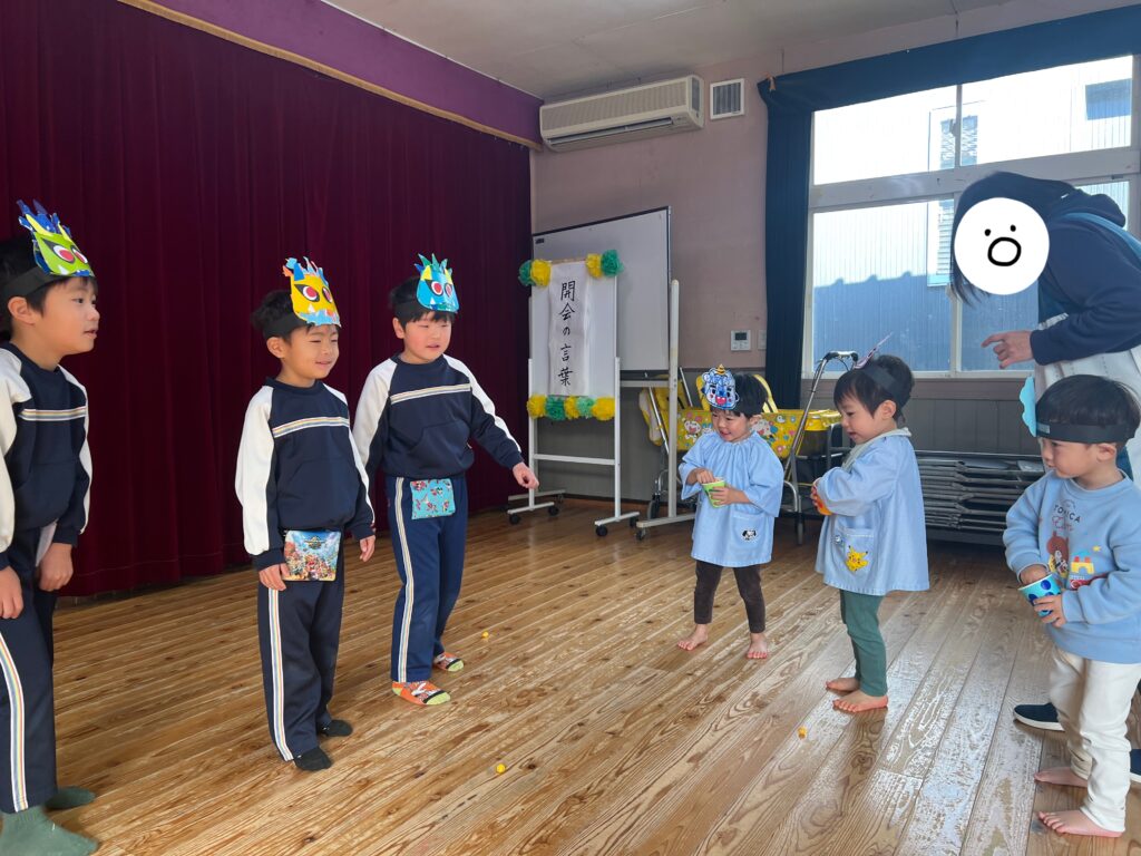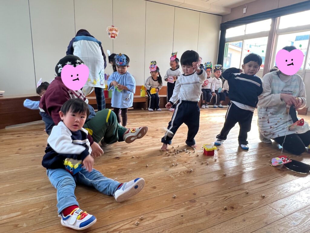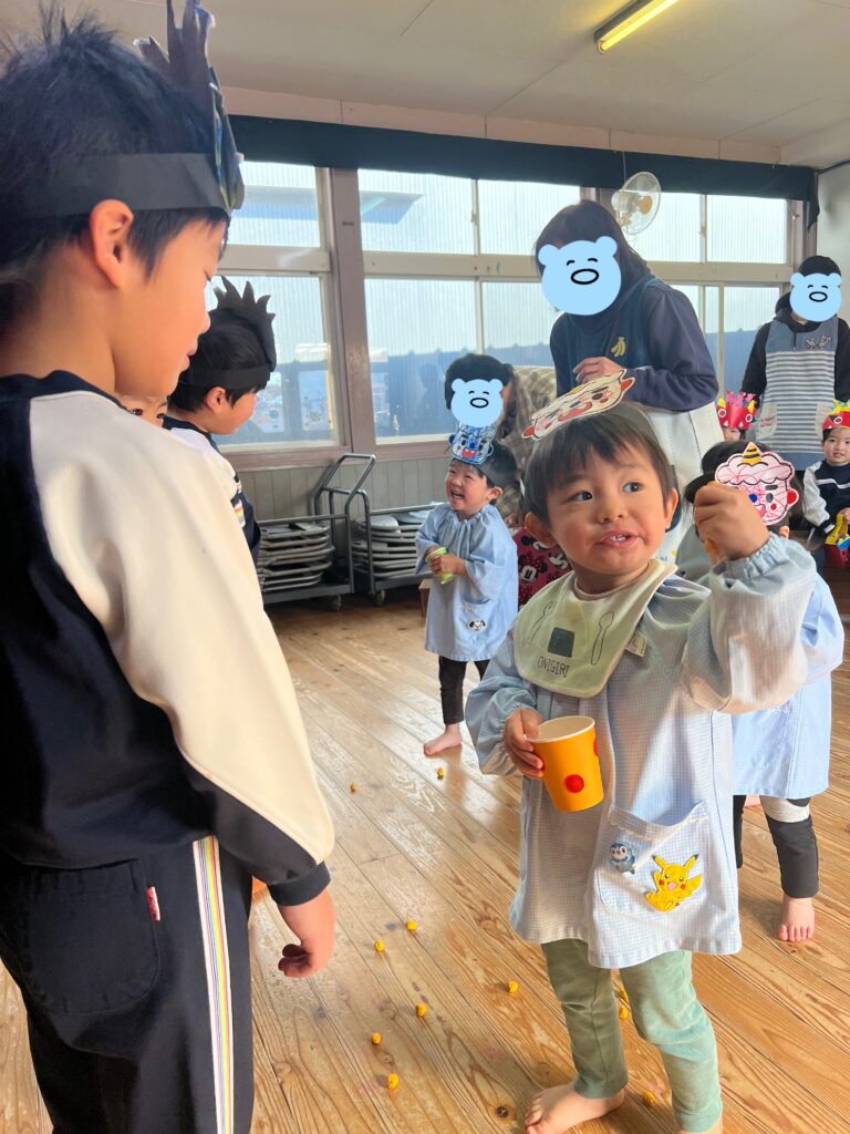 『オニさん役』と『投げる番』に交代しながらみんなで豆まきを楽しみました♪